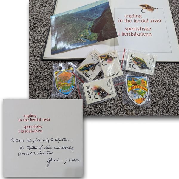 Black leather with wrap around blind strap of a salmon. A collection of 8 essays by authors telling the history of the river and notable angling of huge Salmons. The Laerdal river is the best river in Norway and called the "Queen of Rivers". Printed in 1973. Author John Bruvo